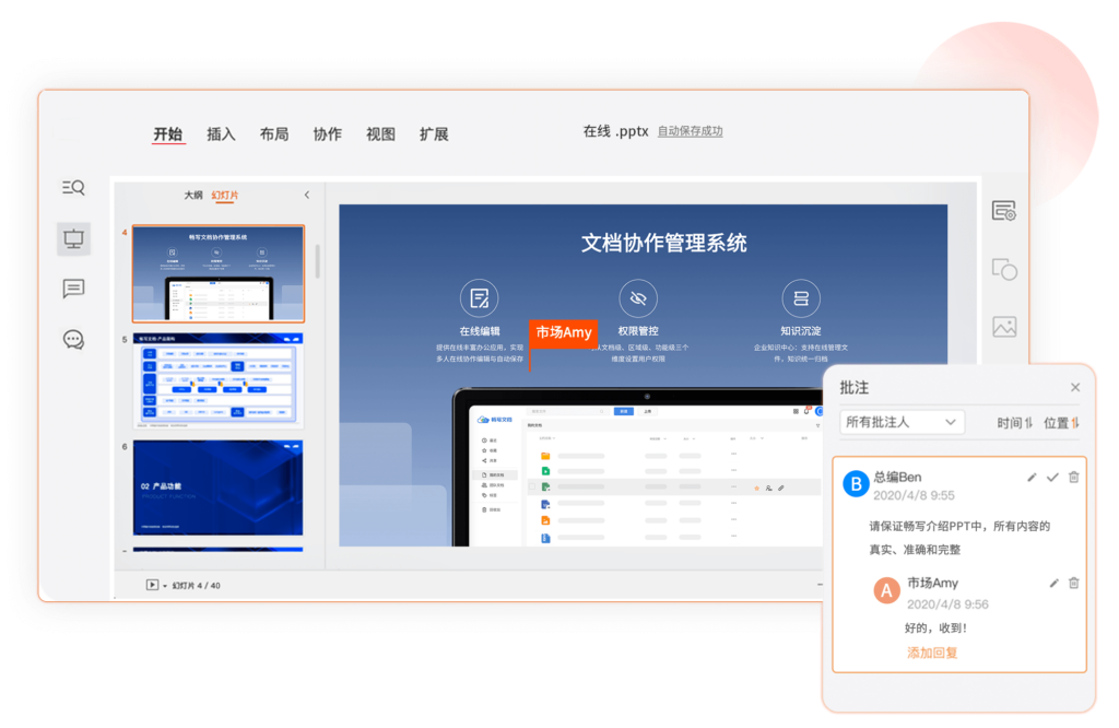 在线在线演示文稿是一款多人编辑PPT文档的在线软件,用户无需下载安装本地PPT软件,