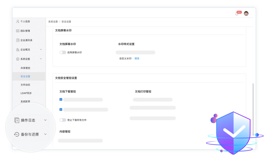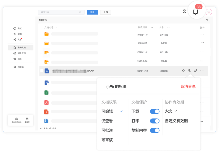 - 功能级权限管控:对文档下载、打印、复制到外部等安全设置