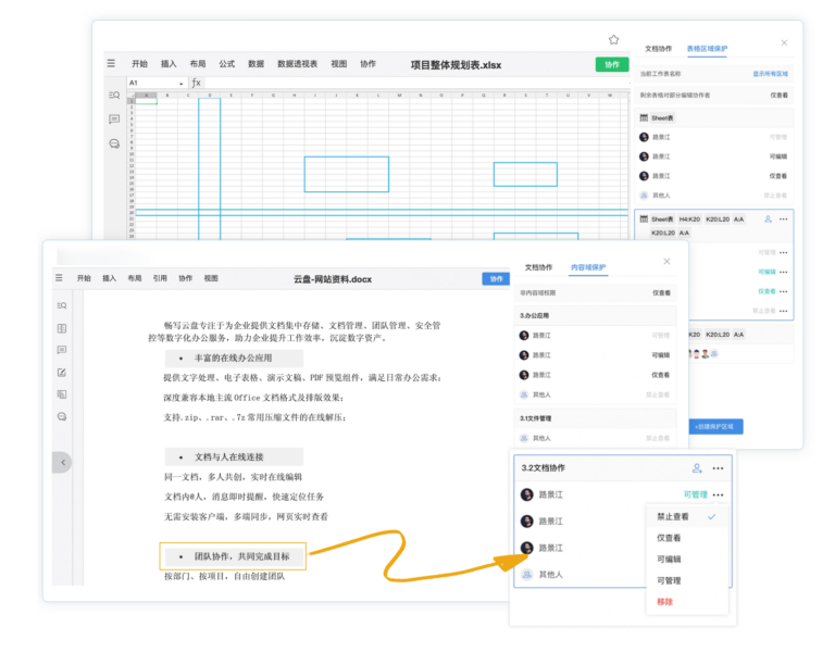 - 区域级权限管控:对文档部分内容、单元格区域设置管控